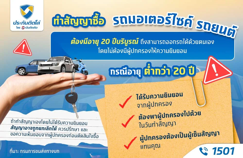 แต่สิ่งสำคัญที่ต้องรู้คือ ถ้าคุณอายุยังไม่ถึง 20 ปีบริบูรณ์ การทำสัญญาซื้อรถจะต้องได้รับความยินยอมจากผู้ปกครองก่อน เพราะกฎหมายถือว่าคุณยังไม่บรรลุนิติภาวะ ไม่สามารถตัดสินใจทำสัญญาได้ด้วยตัวเอง ดังนั้น คุณจำเป็นต้องพาผู้ปกครองไปด้วยในวันทำสัญญา เพื่อให้ผู้ปกครองเซ็นให้ความยินยอม หรือเป็นคนทำสัญญาแทนคุณเท่านั้น