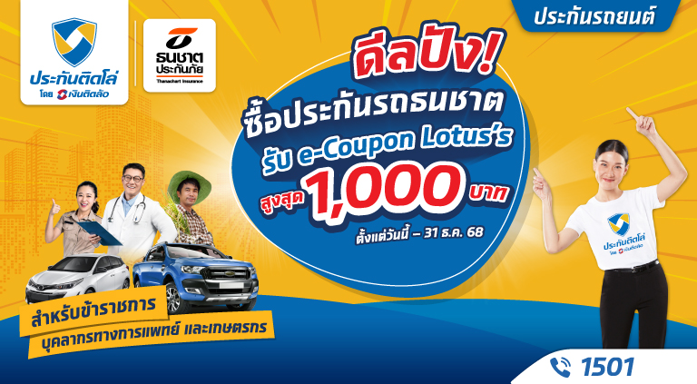 ดีลปัง! สำหรับข้าราชการ บุคลากรทางการแพทย์ และเกษตรกร ซื้อประกันรถธนชาต รับฟรี! e-Coupon Lotus’s สูงสุด 1,000 บาท
