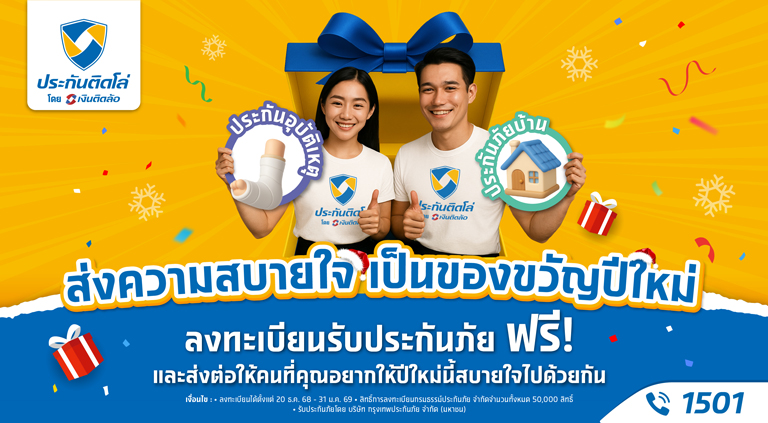 ปีใหม่นี้ ประกันติดโล่มอบฟรี ประกันอุบัติเหตุและประกันภัยบ้าน คุ้มครองทันที 30 วัน ให้ความสบายใจเป็นของขวัญปีใหม่ ลงทะเบียนรับได้ตั้งแต่วันที่ 20 ธ.ค. 68 – 31 ม.ค. 69