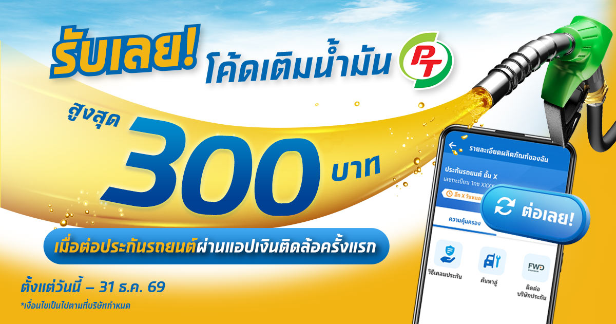 ลงทะเบียนรับสิทธิ์ ตั้งแต่วันที่ 1 ธันวาคม 2568 -31 มกราคม 2569 รับคูปองเติมน้ำมัน บางจาก 300 บาท สำหรับลูกค้าที่ซื้อประกันชั้น 1 ภายในเดือน (จำกัดจำนวน 200 Books แรกต่อเดือนเท่านั้น)